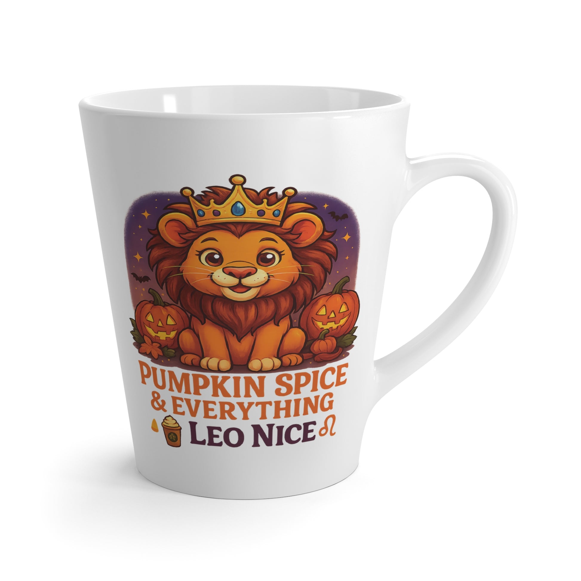 Introducing a delightful Latte Mug that brings warmth and cheer to every coffee break! This charming mug features vibrant designs that celebrate the cozy vibes of autumn. Perfect for savoring your pumpkin spice lattes or herbal teas, it adds a touch of personality to your kitchenware. Ideal for coffee lovers, your favorite Leo, holiday enthusiasts, and anyone who appreciates a spirited touch during fall festivities. Whether you're hosting a Halloween gathering or enjoying a quiet morning, this mug is the perfect companion for your favorite beverages, making your moments even more special. Product features - Microwave-safe for convenient heating - Dishwasher-safe for easy clean-up - Custom design in a 12oz size - Rounded corners for comfortable sipping - C-handle for a secure grip Care instructions - Clean in dishwasher or wash by hand with warm water and dish soap