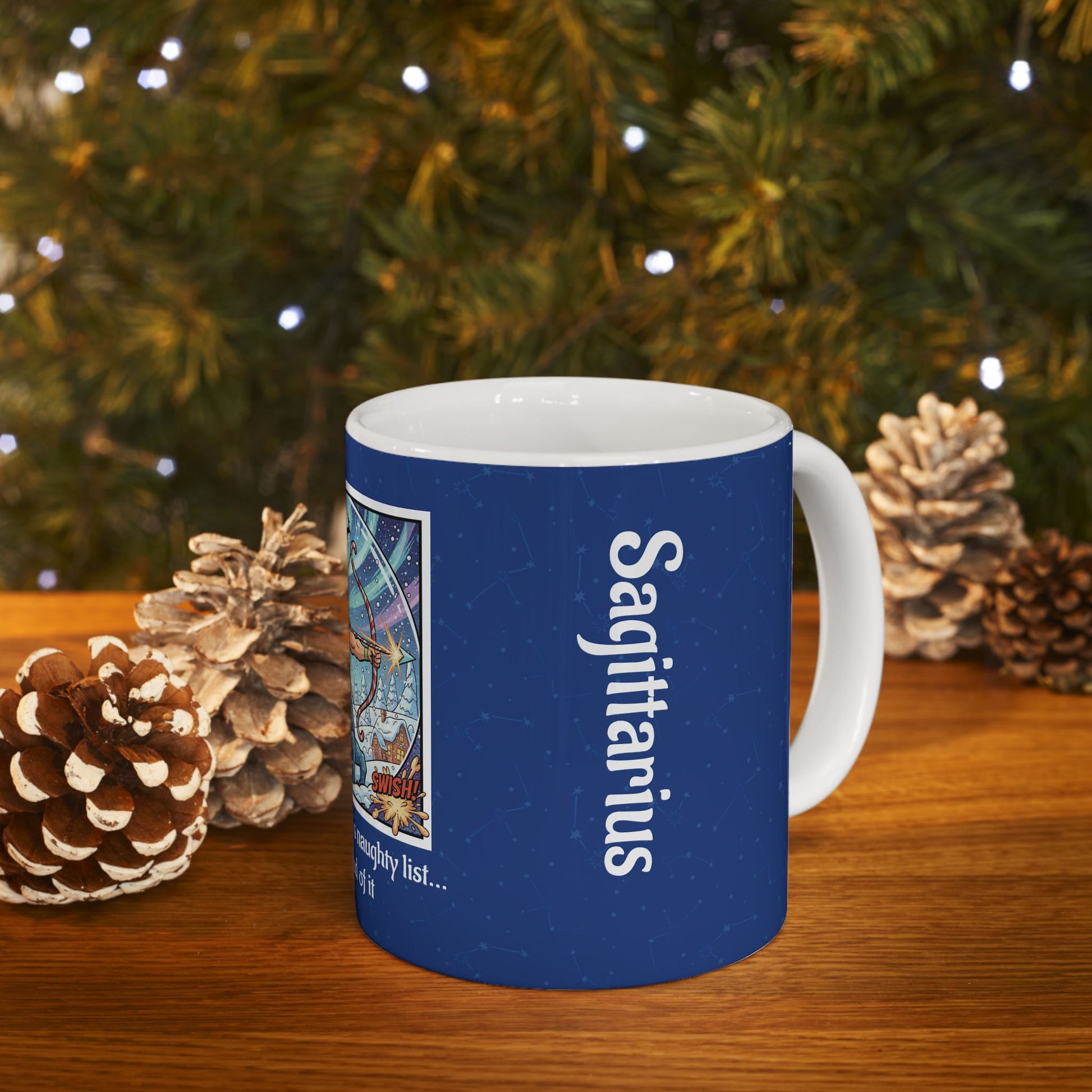 A joyful, cheeky ceramic mug that brings a burst of color and holiday mischief to slow mornings and late-night cocoa. The glossy white ceramic and crisp printing make the illustrated archer-in-winter scene pop against a deep blue wraparound background. Short, punchy text beneath the art adds a playful, rebellious edge — good for laughing over coffee while wrapping gifts, swapping stories at an ugly-sweater party, or sipping something warm after a snowy walk. Sturdy feel, bright finish, and a comfortable C-handle make it an easy everyday companion that still reads like a little seasonal statement.