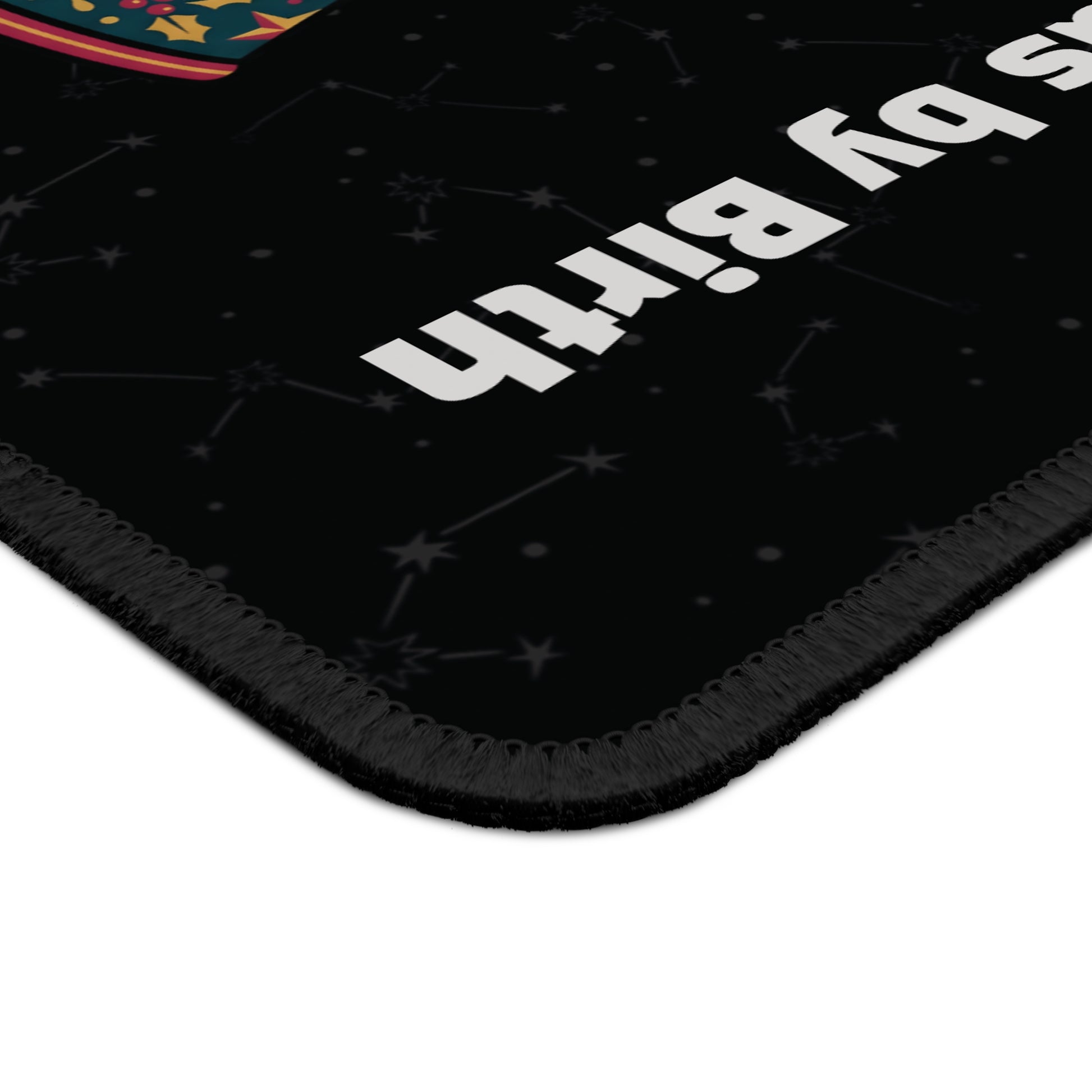 This compact gaming mouse pad brings playful zodiac energy to your desktop. A Sagittarius centaur, bow drawn and wearing a festive Santa hat, stands inside a twinkling snow globe—aurora-like lights swirling behind and tiny gifts at his hooves. The deep black background makes the illustration pop, while bold side text (“Sagittarius by Birth” and “Naughty by Nature”) adds personality and humor. It’s slim, grippy, and stitched for durability, blending everyday functionality with a touch of holiday mischief that brightens work or play sessions.