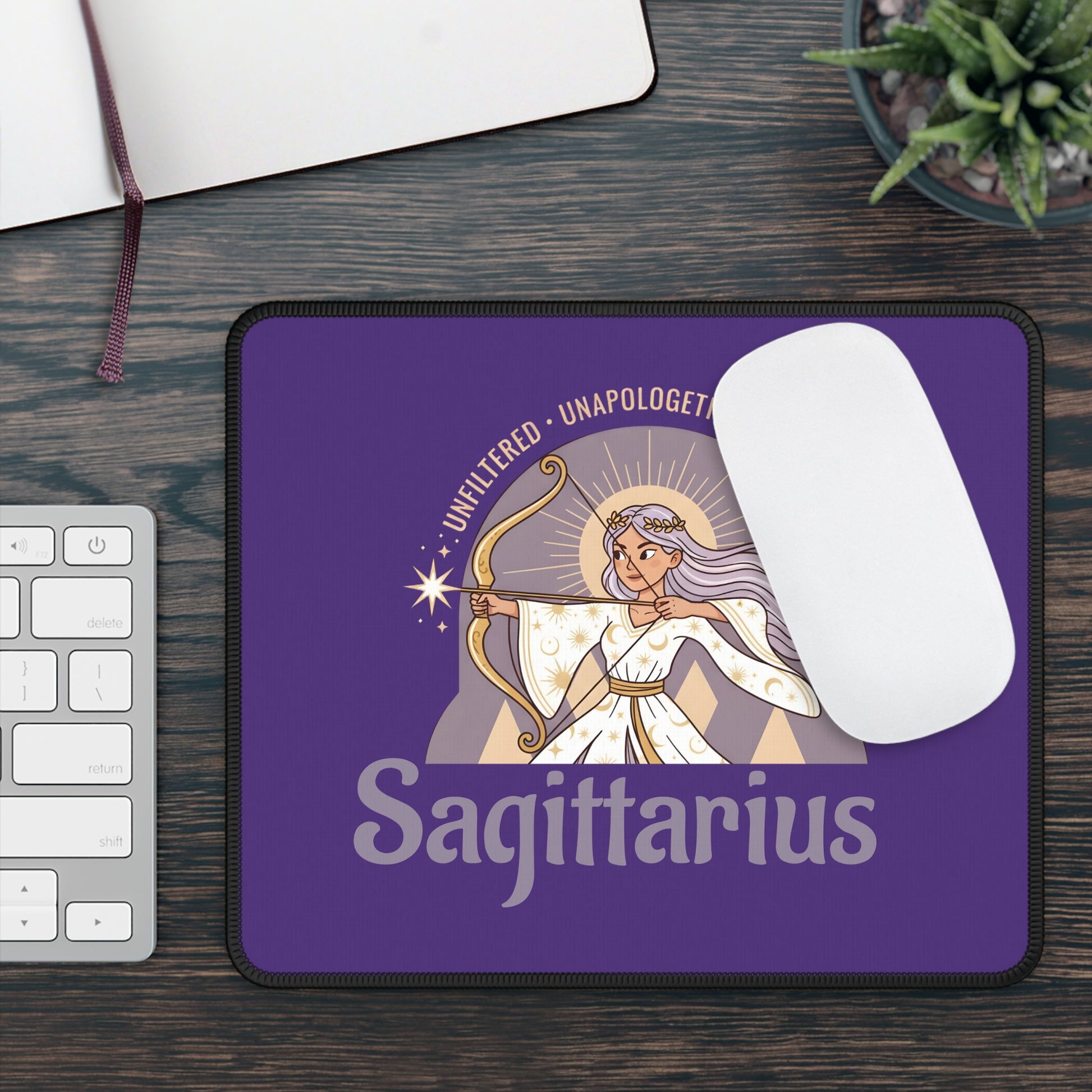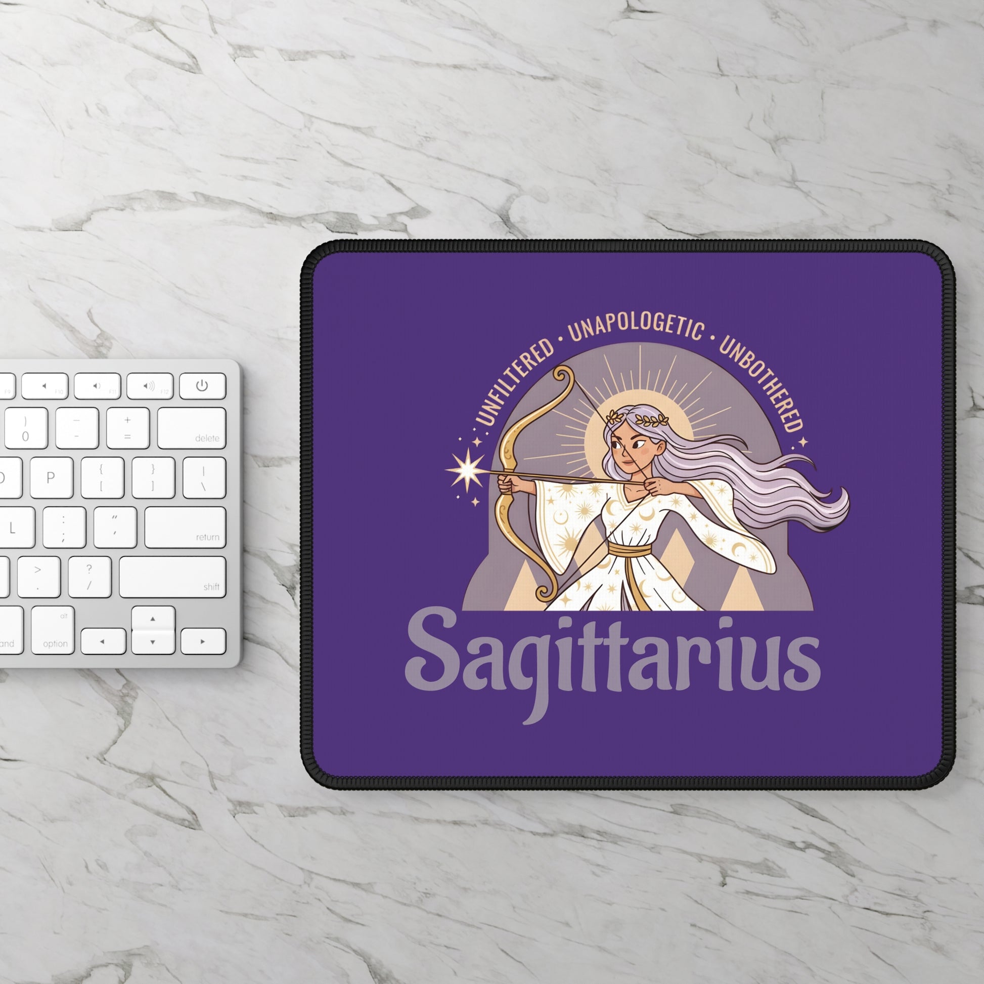 Bring bold constellations to your desk with this Sagittarius mouse pad. The rich purple background highlights an illustrated archer in flowing robes, mid-release, with warm gold accents and the words “Unfiltered. Unapologetic. Unbothered.” above — a little daily reminder of confidence and steady aim. The low-profile neoprene pad glides smoothly under your mouse, grips the desk with a rubber base, and won’t shift during long sessions. Stitched edges keep the artwork intact through heavy use, while full-front printing preserves the vibrant hues of the design. Whether you’re lining up a precision shot or sketching ideas, this compact pad adds personality and purpose to any workspace.