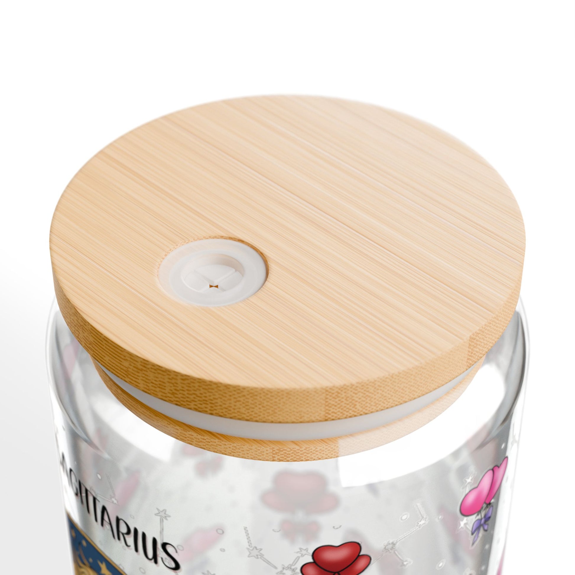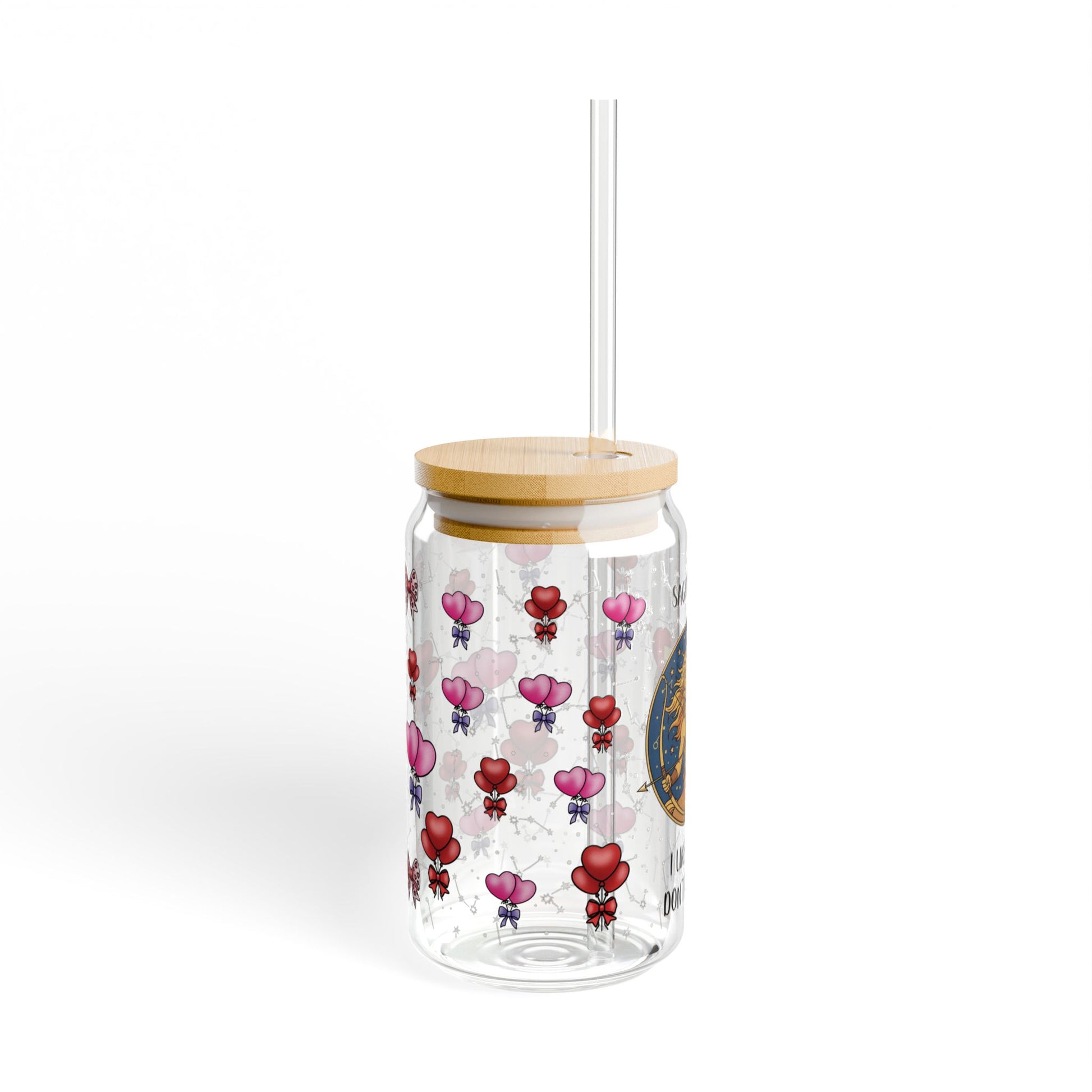 This 16oz sipper glass brings playful astrology charm to everyday sipping. Clear tempered glass showcases the bright, crisp print — a bold Sagittarius illustration surrounded by floating heart balloons — so your drink looks as fun as it tastes. Choose the bamboo push-top lid and durable Tritan straw for on-the-go convenience, or go lid-free for easy pouring. The lightweight, BPA-free Tritan straw resists temperature changes and stays clear wash after wash. Hand-wash care keeps the vibrant colors popping. Made in the USA from globally sourced materials, this glass pairs well with cozy mornings, long study sessions, and late-night chats under the stars.