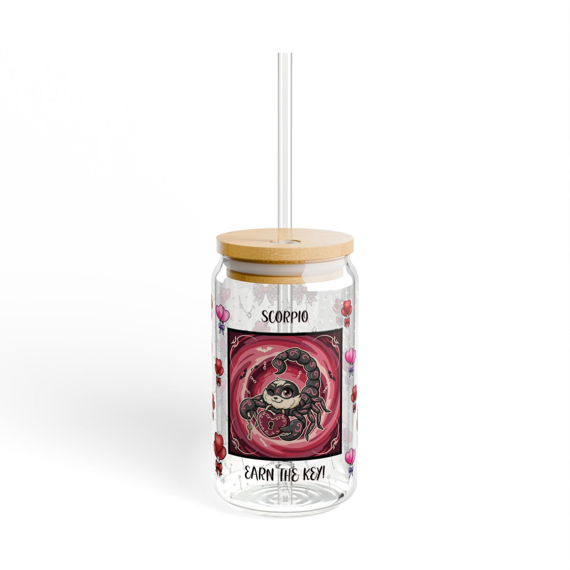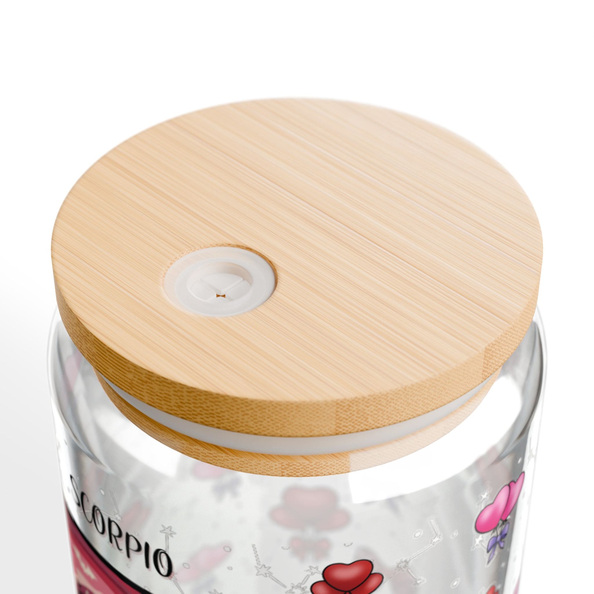 Hold a little piece of personality in your hands. This 16oz glass sipper carries a bold, hand-drawn Scorpio illustration wrapped in deep crimson swirls and tiny heart accents — moody, playful, and a touch mysterious. It feels at home on a cluttered desk while you sketch, beside a late-night playlist, or tucked into a tote for a sunny café stop. The clear tempered glass lets the art breathe; when filled, colors pop and the scene comes alive.