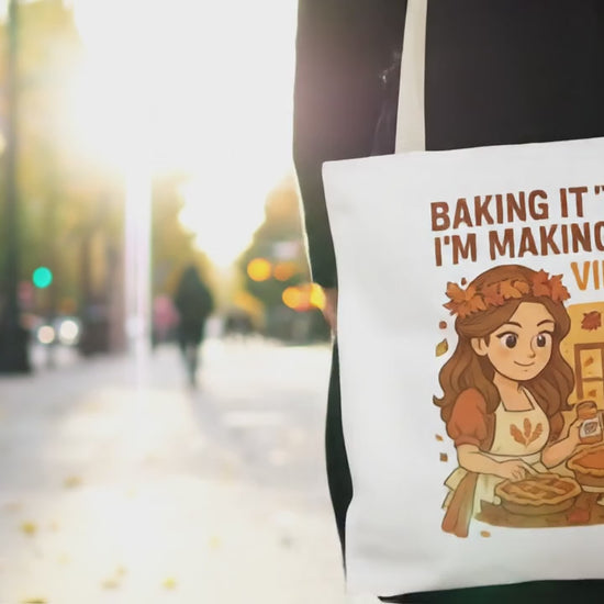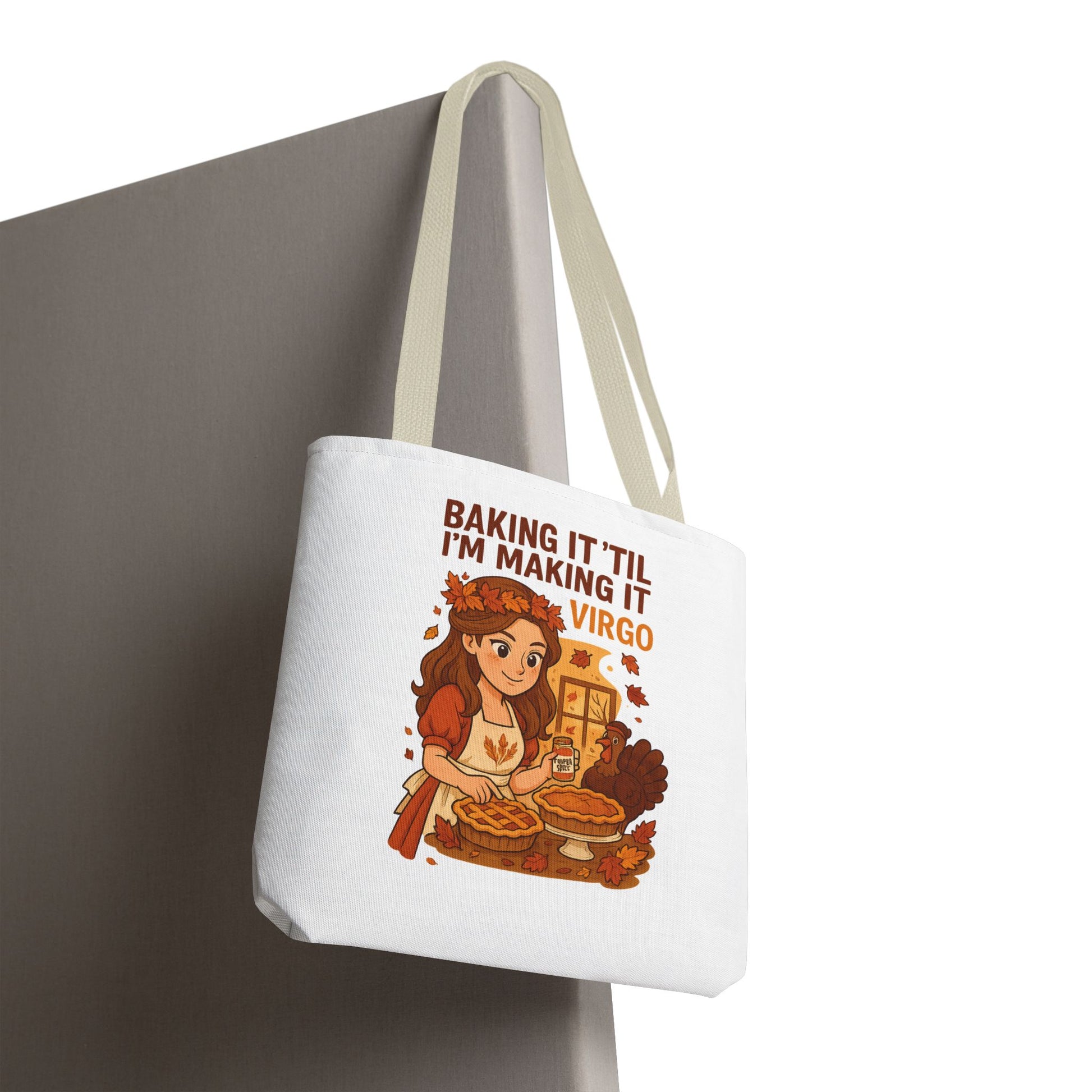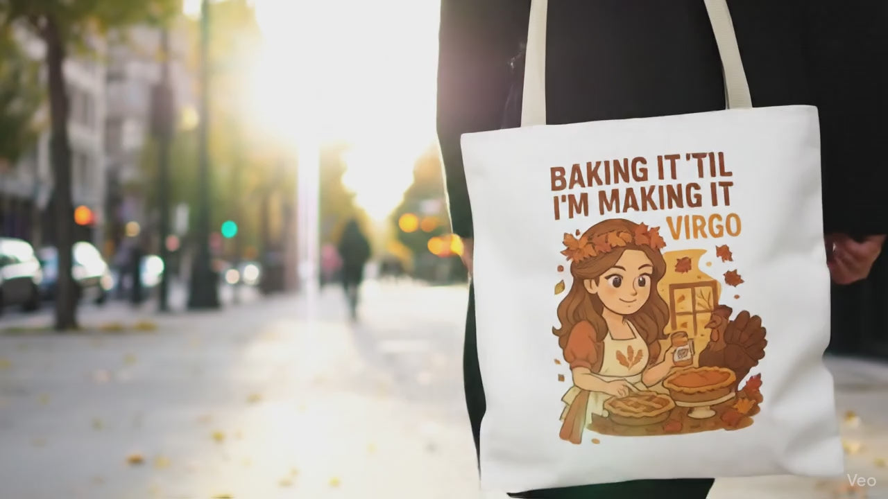 Warm, cozy, and a little bit witty — this tote carries more than groceries. A cheerful autumnal illustration of a focused baker surrounded by pies, spices, and falling leaves announces “Baking it ’til I’m making it — Virgo.” The image sits on a sturdy, smooth polyester canvas that holds its shape and bright colors. Use it to stash your market finds, recipe books, or knitting projects while sharing a slice of personality with every errand or farmers’ market run. The roomy boxed corners and reinforced handles give it practical strength; the laminated interior helps keep spills from seeping through. Subtle black inner stitching and a choice of handle colors let you coordinate with your look. Lightweight enough for every-day carry, this tote feels like a companion for anyone who finds calm and pride in the kitchen and in hands-on, seasonal rituals.